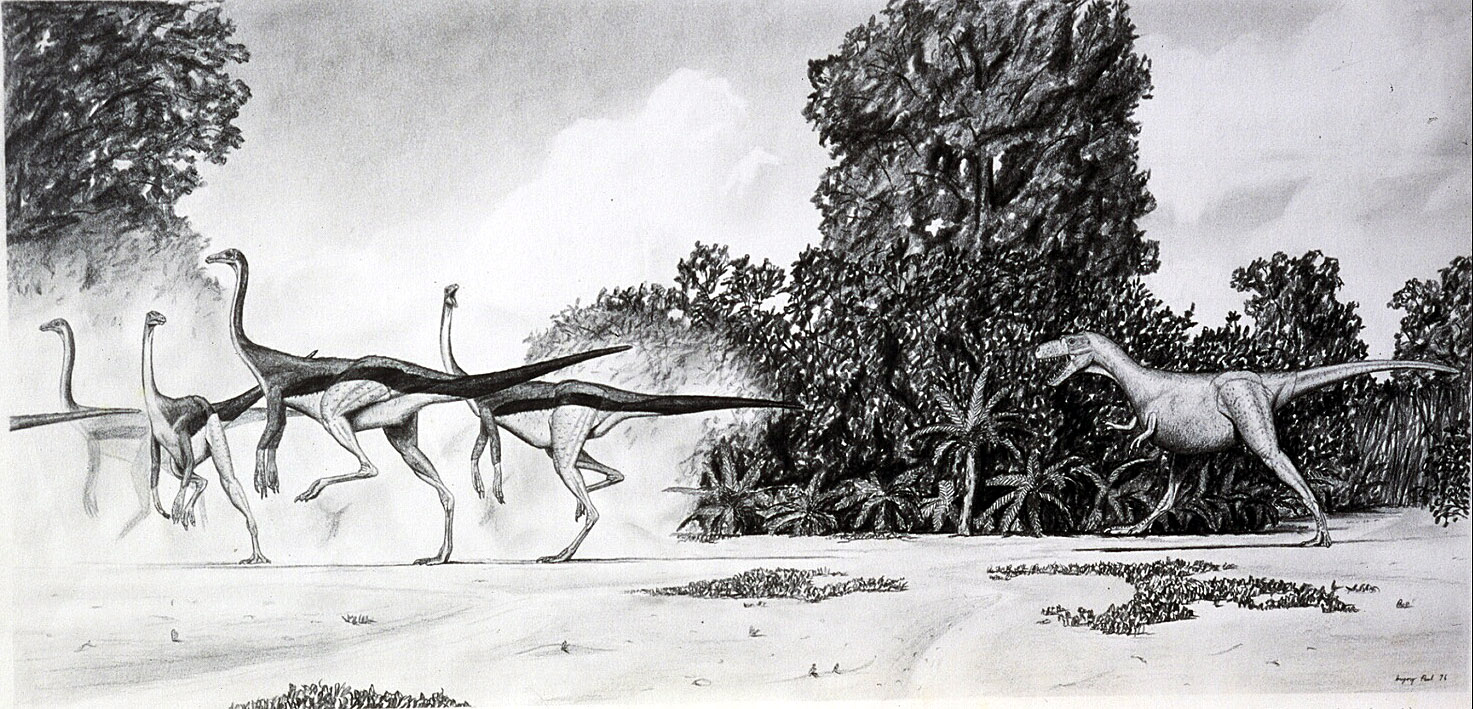 Reprising Martin Luther King’s proclamation of “free at last,” in 1973 I finally escaped the quasi-prison that was grade school and happily began to attend Northern Virginia Community College (NOVA) where I was treated like an adult. (I had contacted Jim (Allosaurus) Madsen about attending the University of Utah under his tutelage, but he warned that the paleontology program had been gutted). That summer I got my first job at a pet store which made sense in that I like tropical fish. Alas I soon was under a manager whose biker appearance resembled Hagar the Horrible, and who boasted of participating in orgies (I am not making this up). The incompetent idiot ended up firing me and I started working at a now defunct drugstore chain. Access to university level libraries as well as that of the Geological Survey upped my level of scientific awareness and knowledge. Now I could peruse technical journals, including Nature which was carrying the early studies by Bakker, one contending that sauropods were giraffe-like browsers – which I disagreed with for a few years. And there was Dale Russell’s research on the super swift ornithomimids, and the big brained troodonts with stereo vision and manipulative hands.