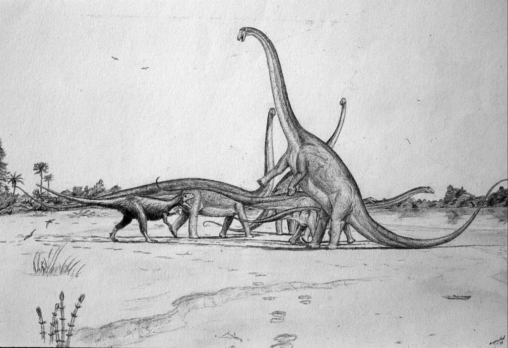 The impact on my art was immediate. After a few years of no production during the high school-college transition, I began to illustrate theropods with feathers, the first being (inaccurately) an Allosaurus attacking Diplodocus.