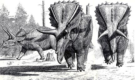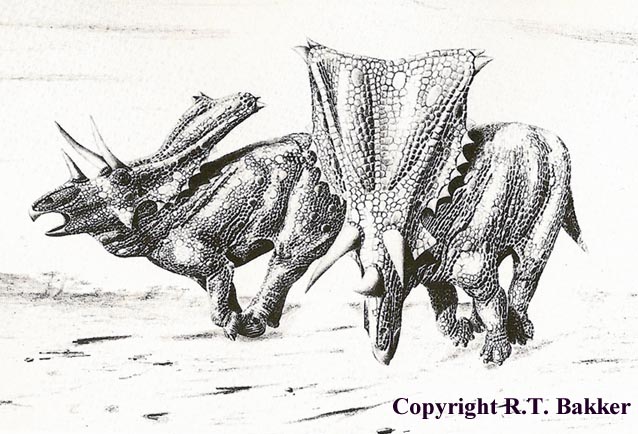 Soon after I visited his lab. This led to two items critical to my future art. Among Bakker’s skeletal restorations was a Triceratops done white bone on a solid black profile.