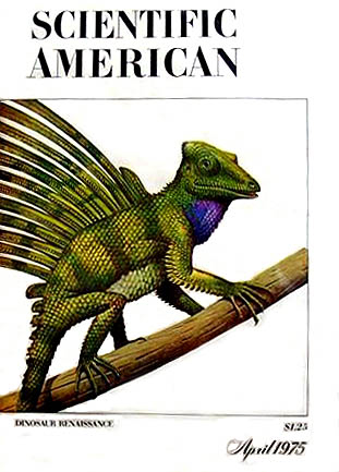 At NOVA I happily took Terry Dyroff’s geology course that covered the parallel revolution in geology as continental drift was proven during the '74-75 session. In April I was heading towards the new scientific journals stacks at the library when I sighted the startling and enticing cover of the latest Scientific American. My excitement rose as I perceived the bright green and bizarre Longisquama cover illustration, with the title “Dinosaur Renaissance.” There was only one person who could be behind this. Sure enough it was Bakker. With Sarah Landry’s furry therapsids in Paleozoic African snows, and the first illustration of a feathered dinosaur, and Syntarsus chasing a gliding lizard down the slope of a dune.