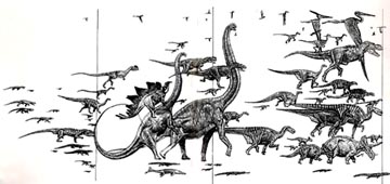 During those years I was taken under the wing as it were of an editor at Smithsonian Press. That led to some commissions for Thread of Life (which also included a rare set of all the Matternes Smithsonian murals, albeit improperly cropped at the sides). At Hopkins, evolutionary scientist Steven Stanley commissioned work for his Earth and Life Through Time. Kindly, grandfatherly Donald (Mr. Trackway) Baird at Princeton hooked me up with the folks at Richard Rush Studios in Chicago. They needed help designing a full-size sculpture of Dilophosaurus for a new trackway exhibit in Connecticut. I was both happy and nervous about the job. Nervous because I was concerned that the studio’s sculptor, Roger Walshlager, would botch his end of the project. Artists often panic when dealing with dinosaurs, producing stereotypical pseudo-animals than the realistic wildlife they really were. When I flew to Chicago to check out his preliminary small scale model I was delighted with the excellent result. You can see the final model at Rocky State Park.